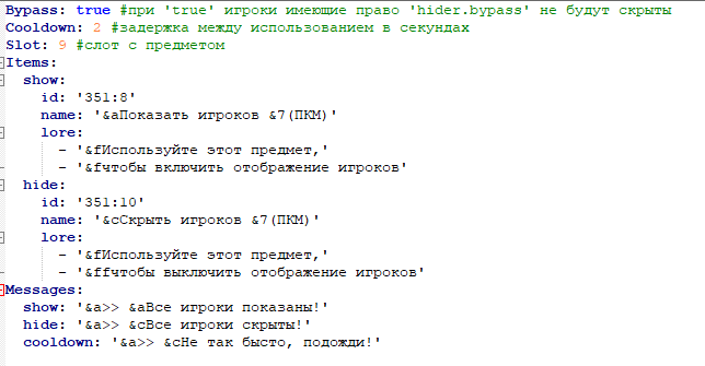 Bypass: true #при 'true' игроки имеющие право 'hider.bypass' не будут скрытыCooldown: 2 #задержка между использованием в секундах